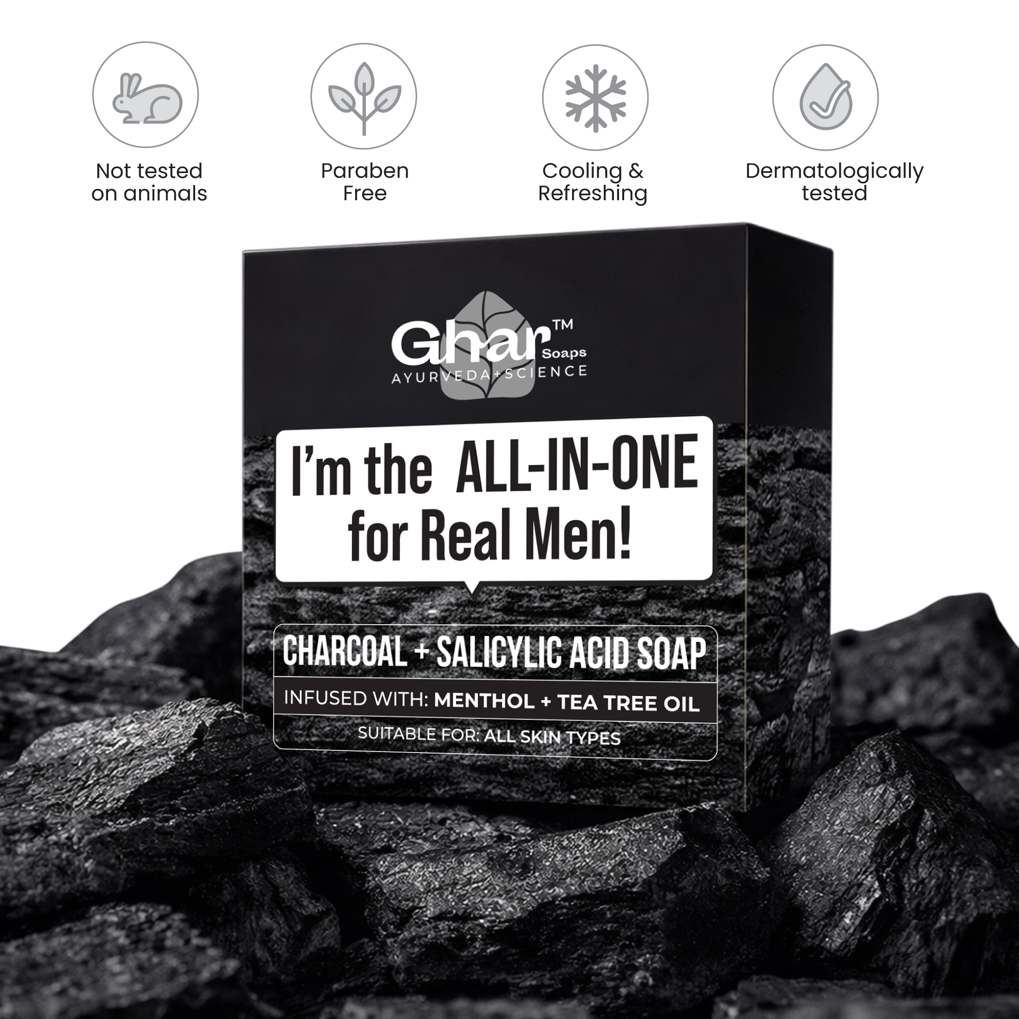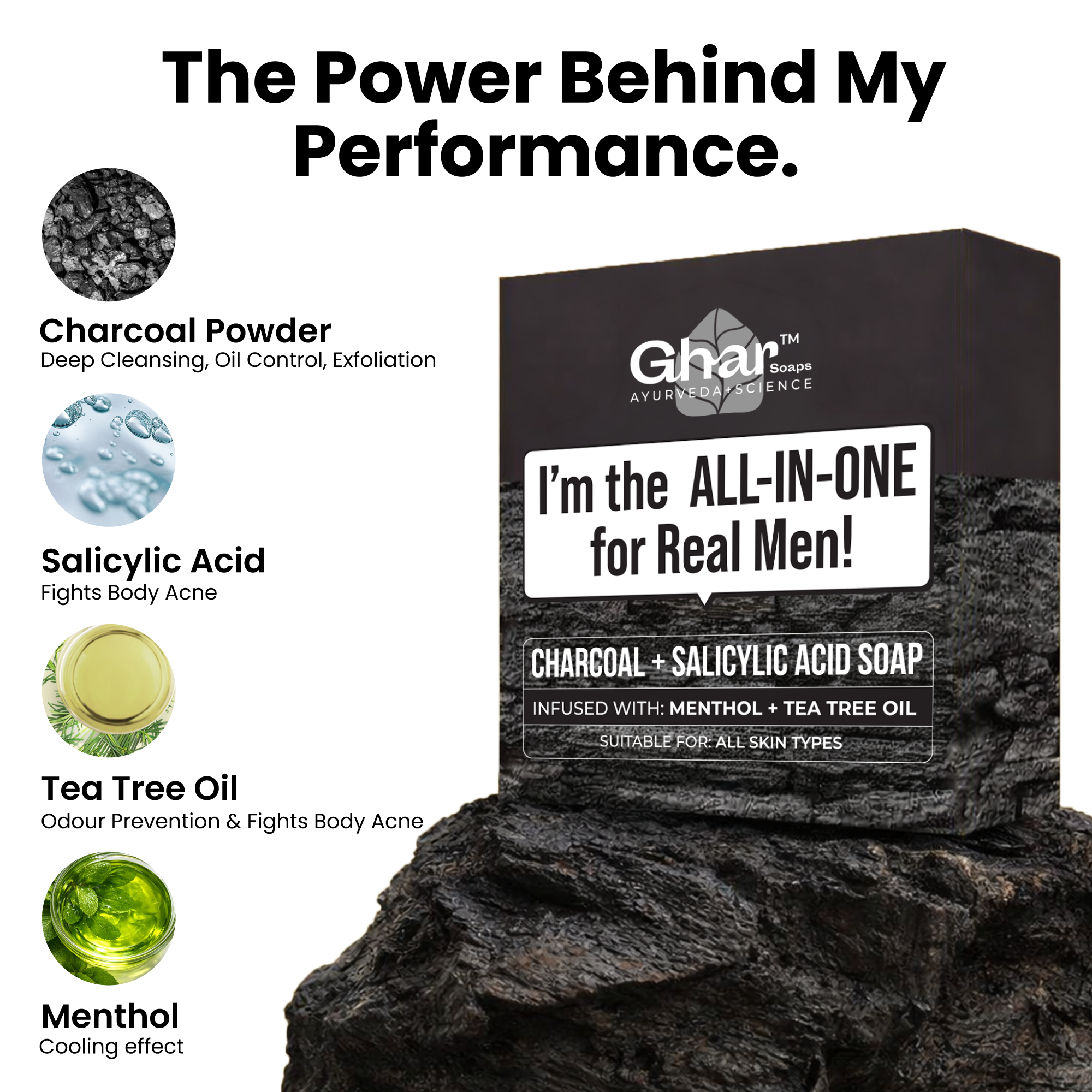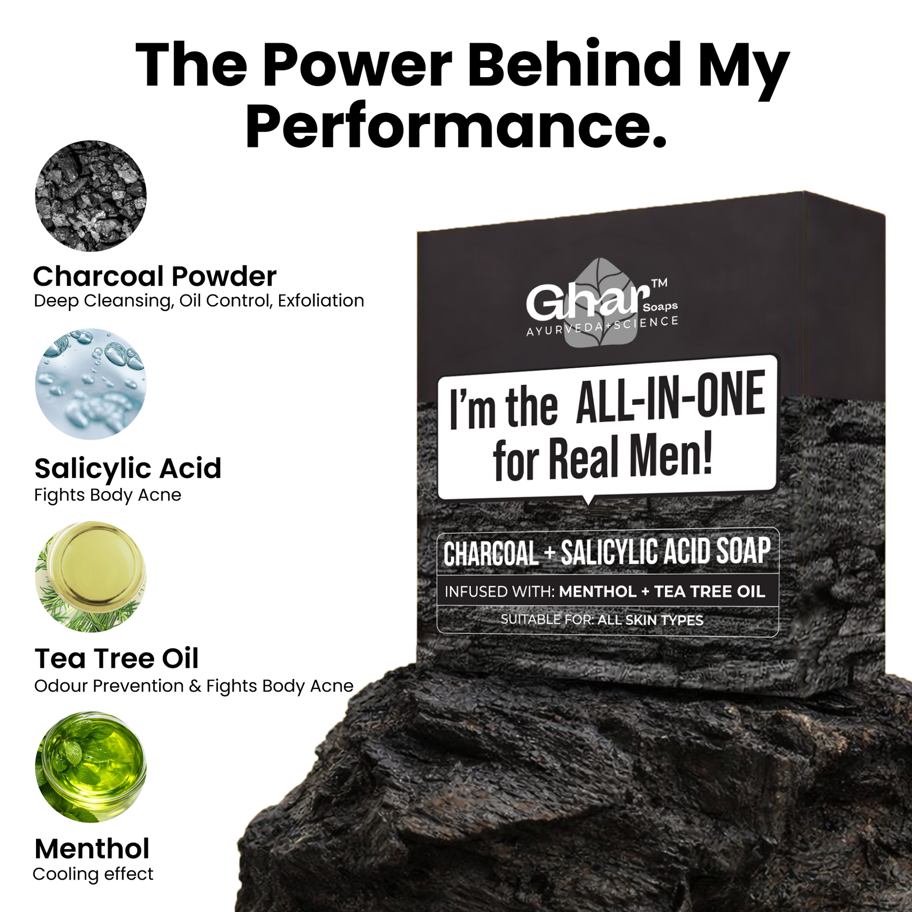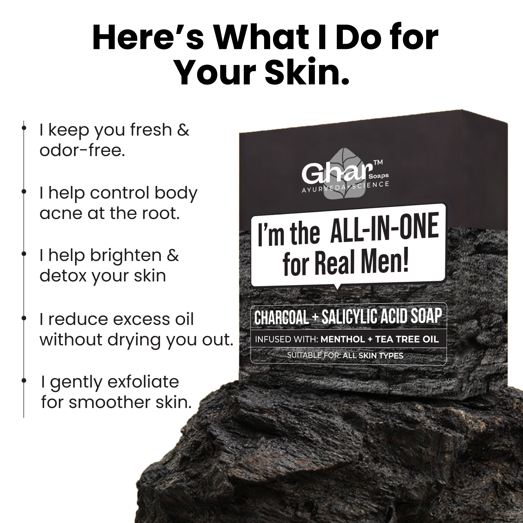 I’m specially made for real men who want clean, clear, and confident skin without dryness or irritation. I fight body acne, control excess oil, and stop odor at the root, while keeping your skin smooth and comfortable. With detoxifying Charcoal Powder to pull out dirt and oil, Salicylic Acid to clear clogged pores and fight body acne, Tea Tree Oil to target bacteria, and Menthol for an instant cooling freshness.