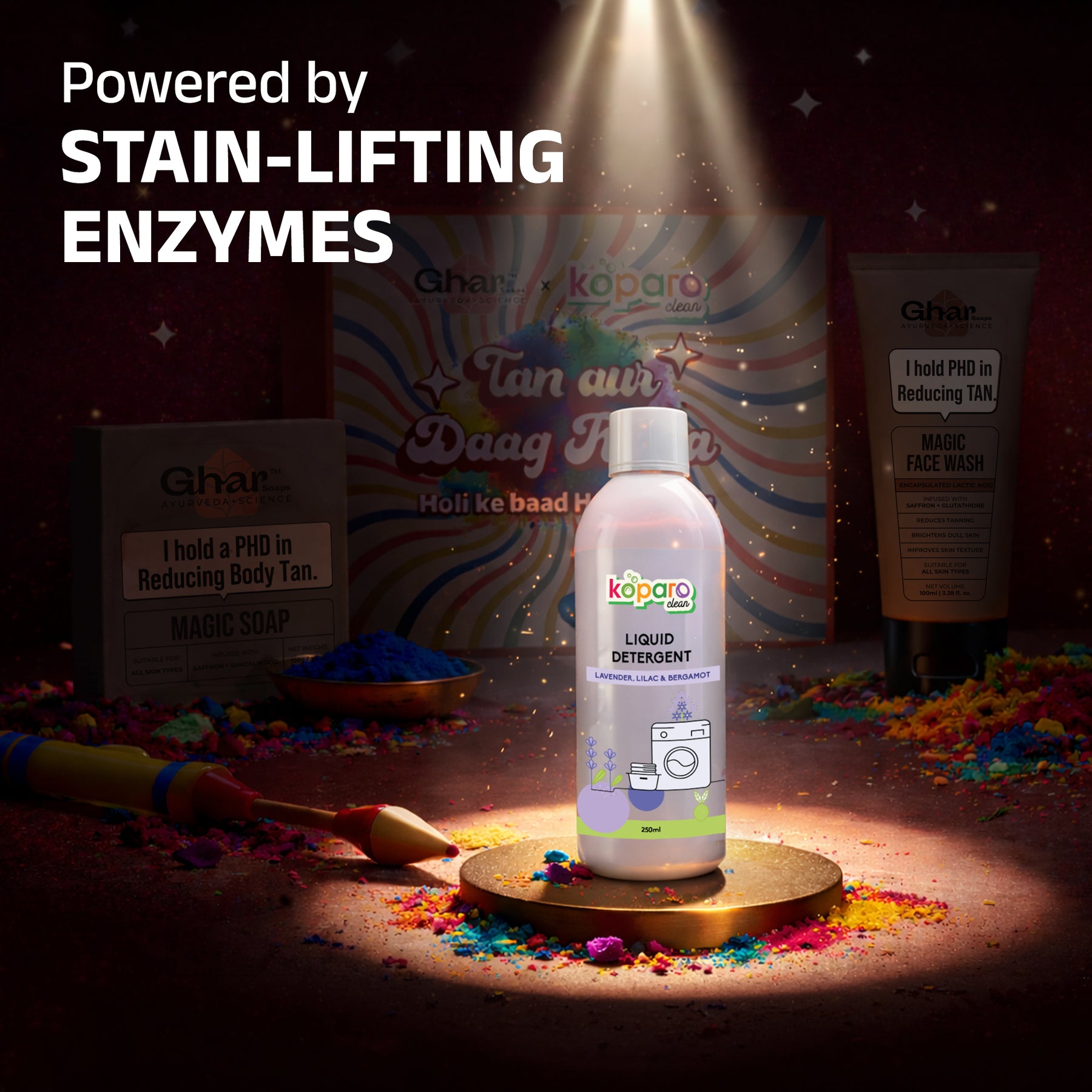 Removes tough Holi stains, powered by a gentle plant-based formula